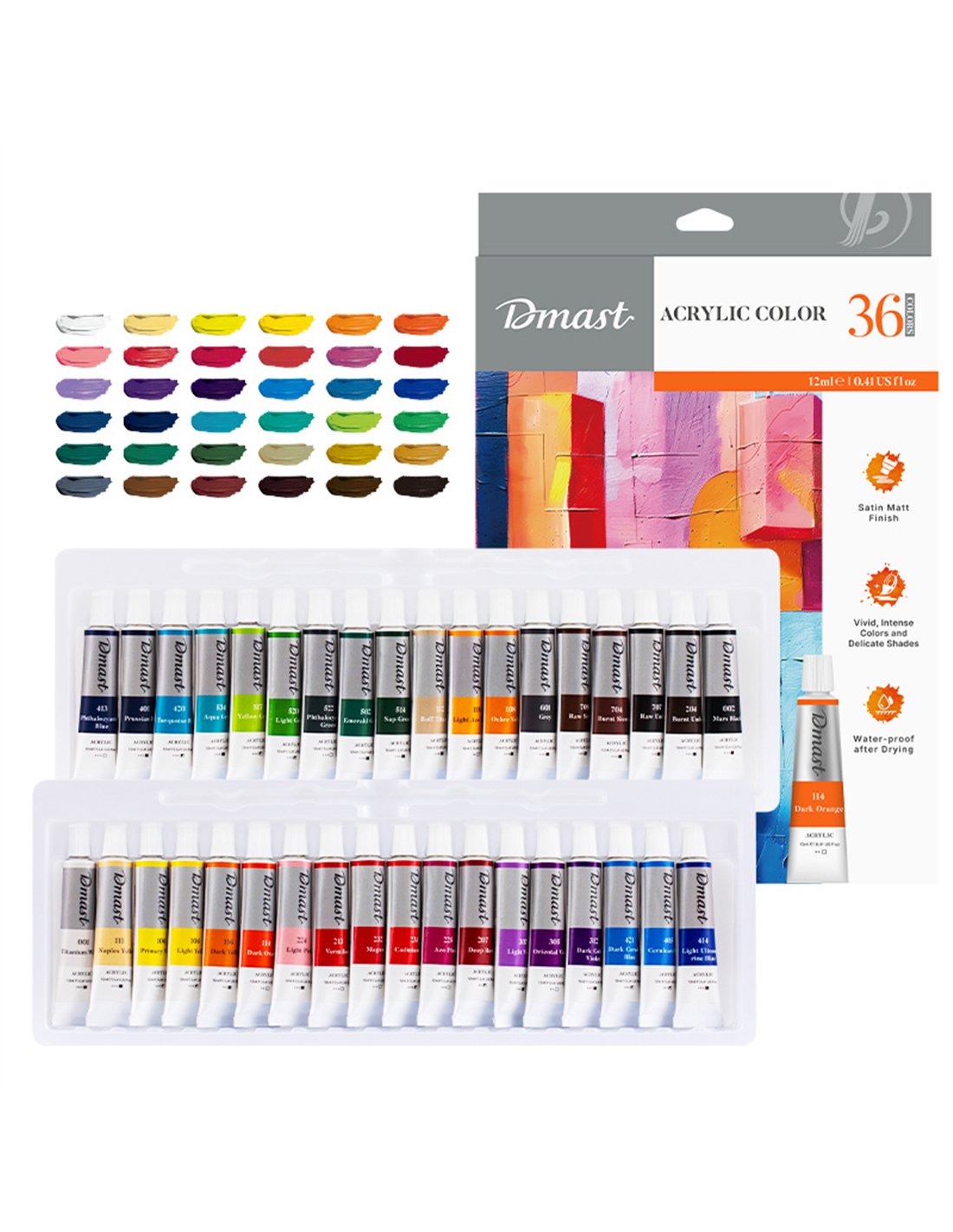 Cutie cu 36 de culori acrilice profesionale Dmast rezistente la apa cu capacitate mare de acoperire.